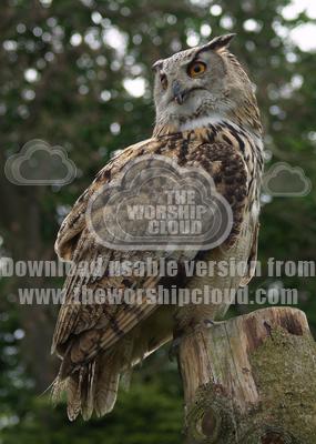 Eagle Owl on perch with head turned