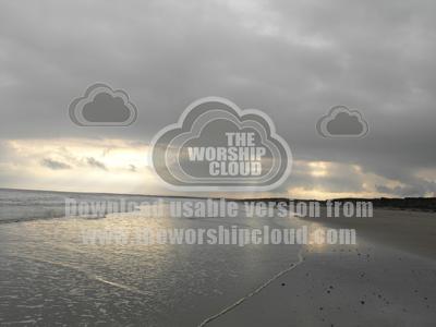 Sunlight breaks through clouds as waves wash up a sandy beach