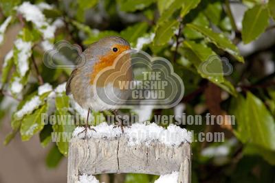 • Robin redbreast closeup snow UK