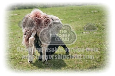 • Cotswold sheep ewe with young lamb suckling Rare Breed Trust Cot