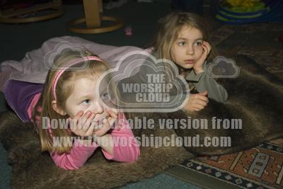 Two young children lying on lounge floor covered by blankets watching television late at night