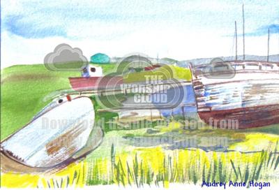 Water colour painting of boats on a Falkland Island beach. Painting by Audrey Anne Hogan.