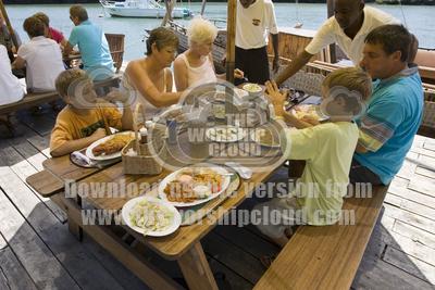 Informal family sharing meal of sea food at The Moorings floating restaurant near Mombasa, Kenya