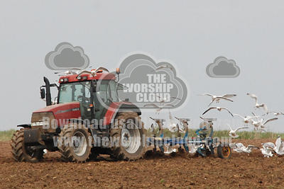 A typical farm scene near the coast, seagulls follow the tractor in the hope of recovering seed from the newly turned soil