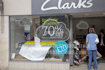 Final clearance sale notices in shoe shop window offering big discounts Cheltenham UK