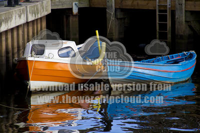 A bright orange and a bright blue fishing boat at Whitby with lovely colourful reflections