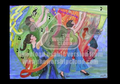 from my original water colour sketch executed in my sketch book while the worship was in progress.I have tried to capture the joy and the exuberance of the flag dancers as they gave the Lord a "Wave Offering"