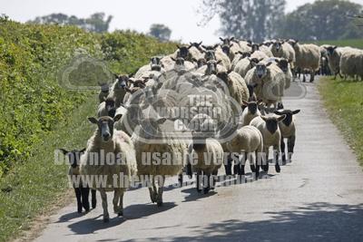 • Flock of Masham sheep and lambs being driven down country road