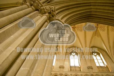 An upward view of a fluted column leading to the arch above, supporting a Cathedral ceiling