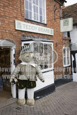 Giant teddy bear stadning outside world famous teddy bear museum in old 16th century building in town of Stratford-upon-Avon, UK