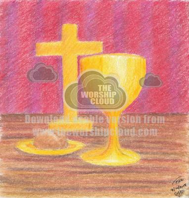 A Cross, communion chalice, a plate with communion bread, on a table with a red curtain backdrop.