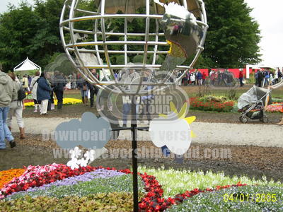 Metal sculpure of the earth / globe with clouds etc stands among the flower bed at Tatton Park Flower Show 2007 interesting display. Digital photograph by Audrey Hogan
