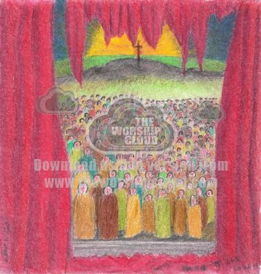 Image from within the temple curtain looking out upon the church gathered in the light of the cross as a new day dawns