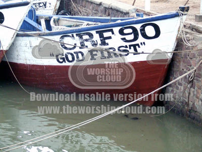 Image of a religious slogan: 'God First' inscribed on a boat at the fishing port of Elmina, Ghana, 2007.