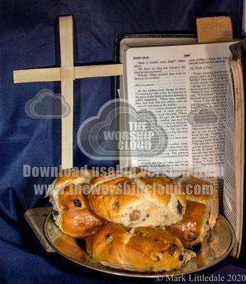 Palm Sunday Cross, with Hot Cross Buns and open Bible.