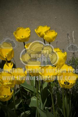 A bunch of gorgeous yellow tulips growing in a garden on a sunny day
