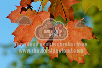 Red leaves against a blue and green backdrop.