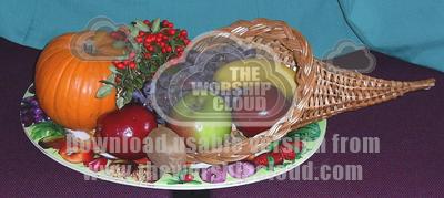 Digital photograph of still life for harvest festival display photograph by Bill Hogan display by Audrey hogan Fruit and horn of plenty basket.
