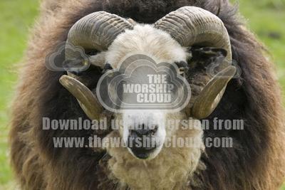 Head and horns of Shetland sheep ram Rare Breed Trust Cotswold Farm Park Temple Guiting near Stow on the Wold UK. The smallest breed of British sheep it was thought to be brought to the Shetlands by the Vikings over 1000 years ago.