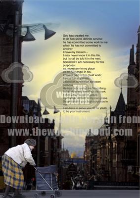 A visionary text by John Henry Newman accompanies a photomontage of a heroic shopper setting out against the backdrop of a steep shopping street