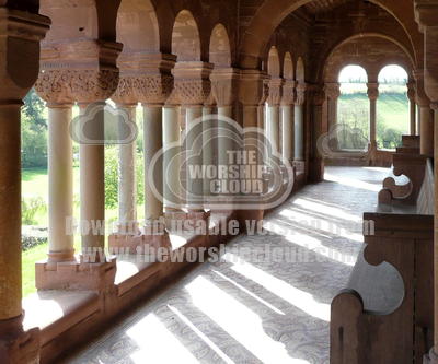 Italianaye church, Hoarwithy, UK. Entry arcade with the sun streaming through the arches - all of which are different