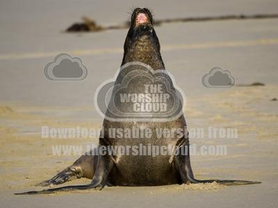 Hookers sea lion Phocarctos hookeri hauled out on beach Serat Bay Catlins South Island New Zealand. This is one of the rarest and most endangered species of sea lions which were hunted for oild and hide until hunting was banned in 1893.