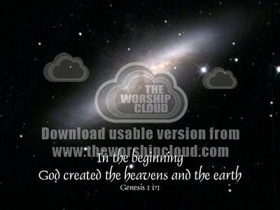 Text Genesis 1 'In the beginning God created the heavens and the earth.' Set against NASA background image cosmos.