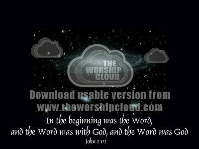 Text John 1 'In the beginning was the word' set against background BASA galaxy space image.