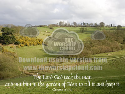 Text Genesis 2 The Lord God put the man in the garden to till it and keep it - woodland and gorse on side of valley on Cotswolds escarpment at Mickleton near Chipping Campden UK