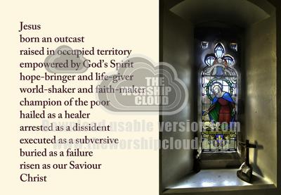 Poem accompanied by picture of stained glass window showing the birth of Jesus, with a wooden carving of his crucifixion and a figure of a woman holding spices for his burial placed on the window ledge in front of it.