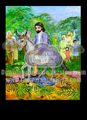 An acrylic painting depicting Jesus riding upon a donkey as he enters Jerusalem. The crowd wave palm branches. This illustration makes a good Palm Sunday illustration for display in church. It looks good along side a display of palm branches. Painted by Audrey Hogan