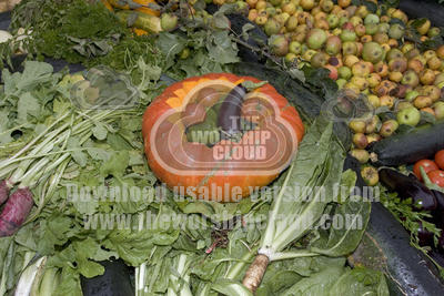 Large pumpkin fruit and vegetable display, Cider Fayre, France