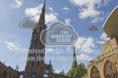 Paralax view of the spires of the original Coventry Cathedral and Holy Trinity