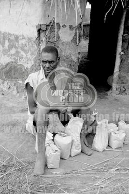 This gentleman has lost his toes to leprosy, and lives with his family in a colony. The packages at his feet are gifts from the local church. They, and his child, are signs of hope for the future. Despair at his condition shows in his expression.