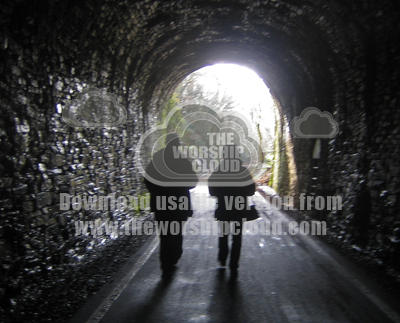 Grenofen tunnel (part of National Cycle Network). Silhouette of man and woman walking towards the light.