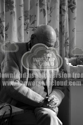 Black and white photograph of an elderly man in his 80s listening/praying in his home.