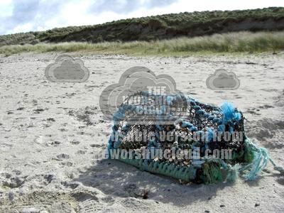 A lobster/crab pot washed up on the crisp white sands of Iona.