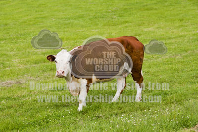 A brown and white cow pausing while eating to see who's looking at her.
