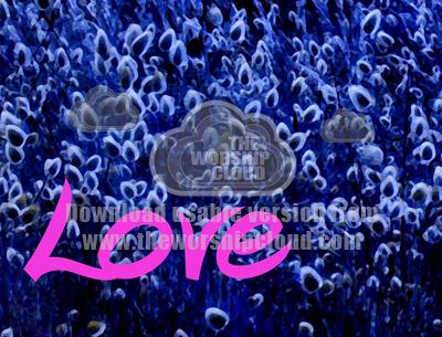 The word love against a blue background of grass.
