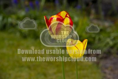 A gorgeous pair of yellow and red tulips in the sun