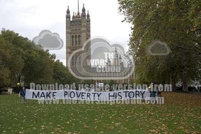 Make Poverty History banner outside Parliament for Trade Justice lobby