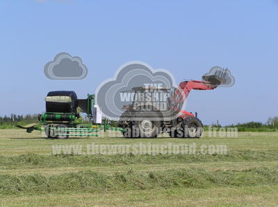 This is the fourth in a series of photos showing the process of making silage (the farmer stores this then it's used as fodder for his cattle during the winter months). Here, the round hay bale has been scooped up onto the bale-wrapper machine, and as the tractor moves along, the bale is automatically turned, being wrapped by the black plastic as it does so.