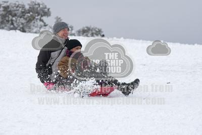 • Boulton family going sledging in deep snow Cleeve Hill Cotswolds