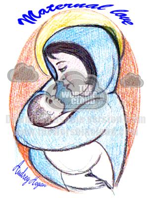 "Maternal love" drawing by Audrey Hogan in coloured pencils. Suitable as a card for Mothers day or Christmas.