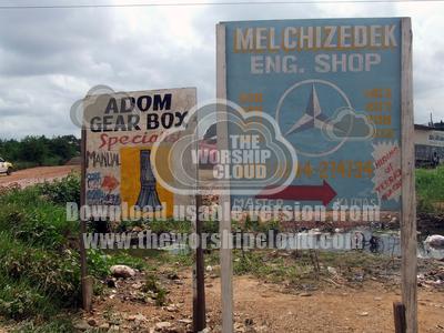 Image of religious slogan: 'Melchizedek Engineering Shop' and 'Adom ['Grace' in Twi] Gear Box Specialists', advertising local businesses in Ofankor, Accra, Ghana, 2007.