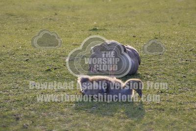 A mother greylag guards her offspring as they feed