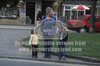 • Dad waiting with children to cross road safely, Broadway, UK