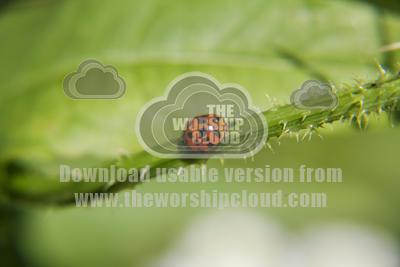A brightly coloured multispot ladybird ambling along a bramble stem