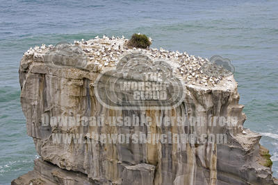 Nesting gannets at Muriwai gannet colony off west coast near Auckland North Island New Zealand. Established around 1900 the gannets replace an earlier nesting site for white terms. By the mid 1970s the gannets had run out of space and began nesting on the mainland. Over 1000 pairs now nest here annually.