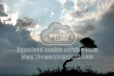 A tiny, wind-blown tree, stands pout against a stormy sky